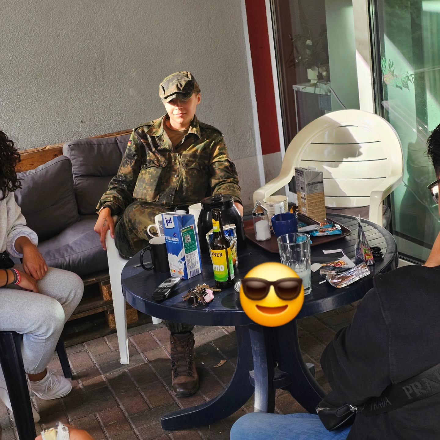 Am 25.08.25 war uns zufällig in ihrer Freizeit eine Bundeswehrsoldatin besuchen. Die Jugendlichen und sie kamen ins Gespräch. Es wurden einige Fragen beantwortet und die Neugier der Jugendlichen nahm kein Ende. Ein super Austausch! Danke dafür .