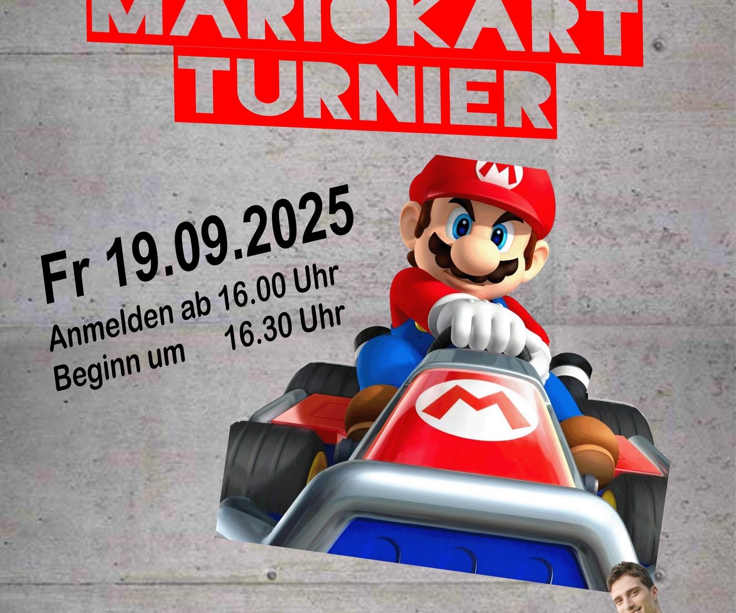 Jo was geht ab! Du gegen Mario? Auf gehts! Wir planen ein Mariokart-Turnier für euch. Kommt vorbei und meldet euch bis zum 19.9. um 16 Uhr an! Wir freuen uns auf euch.